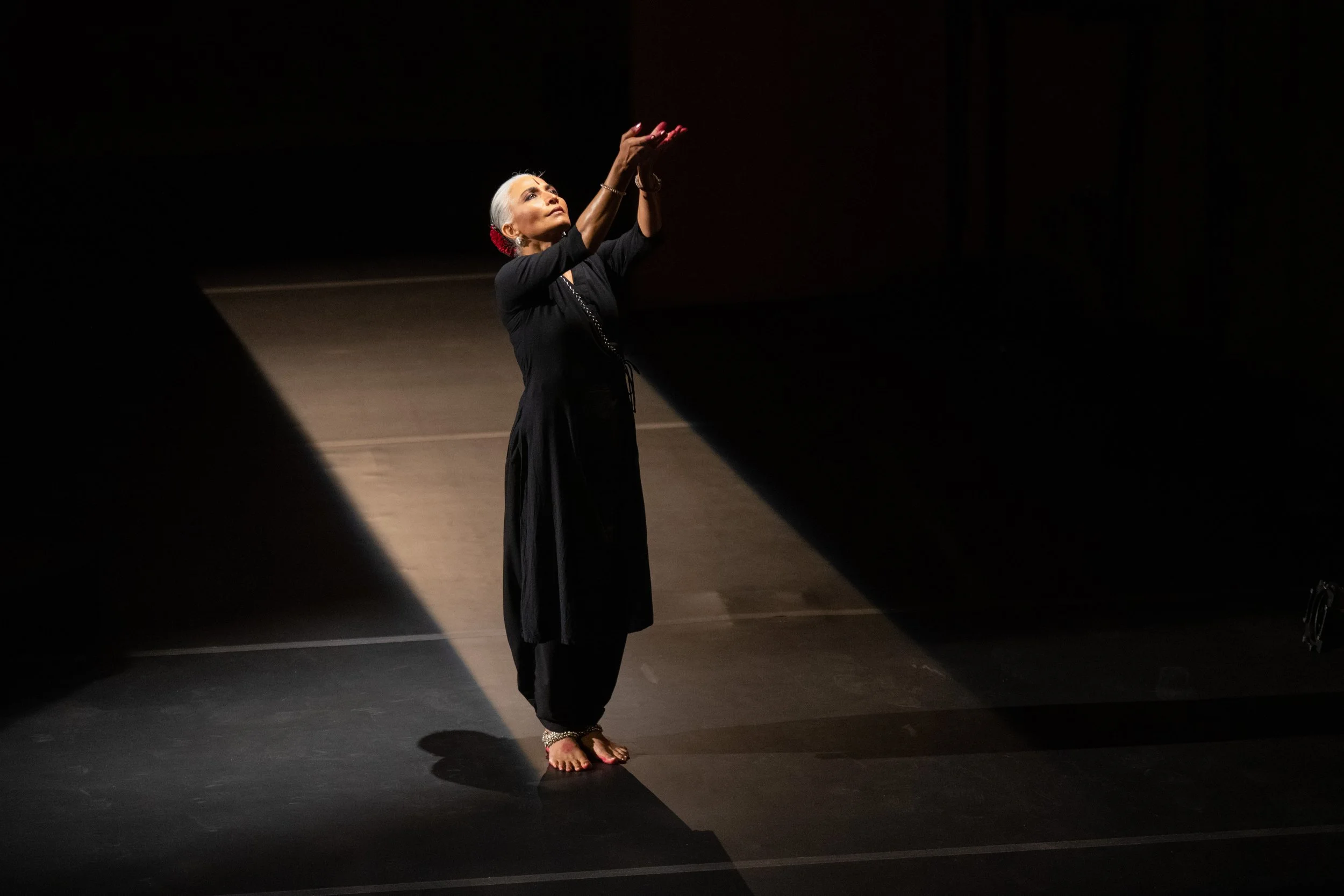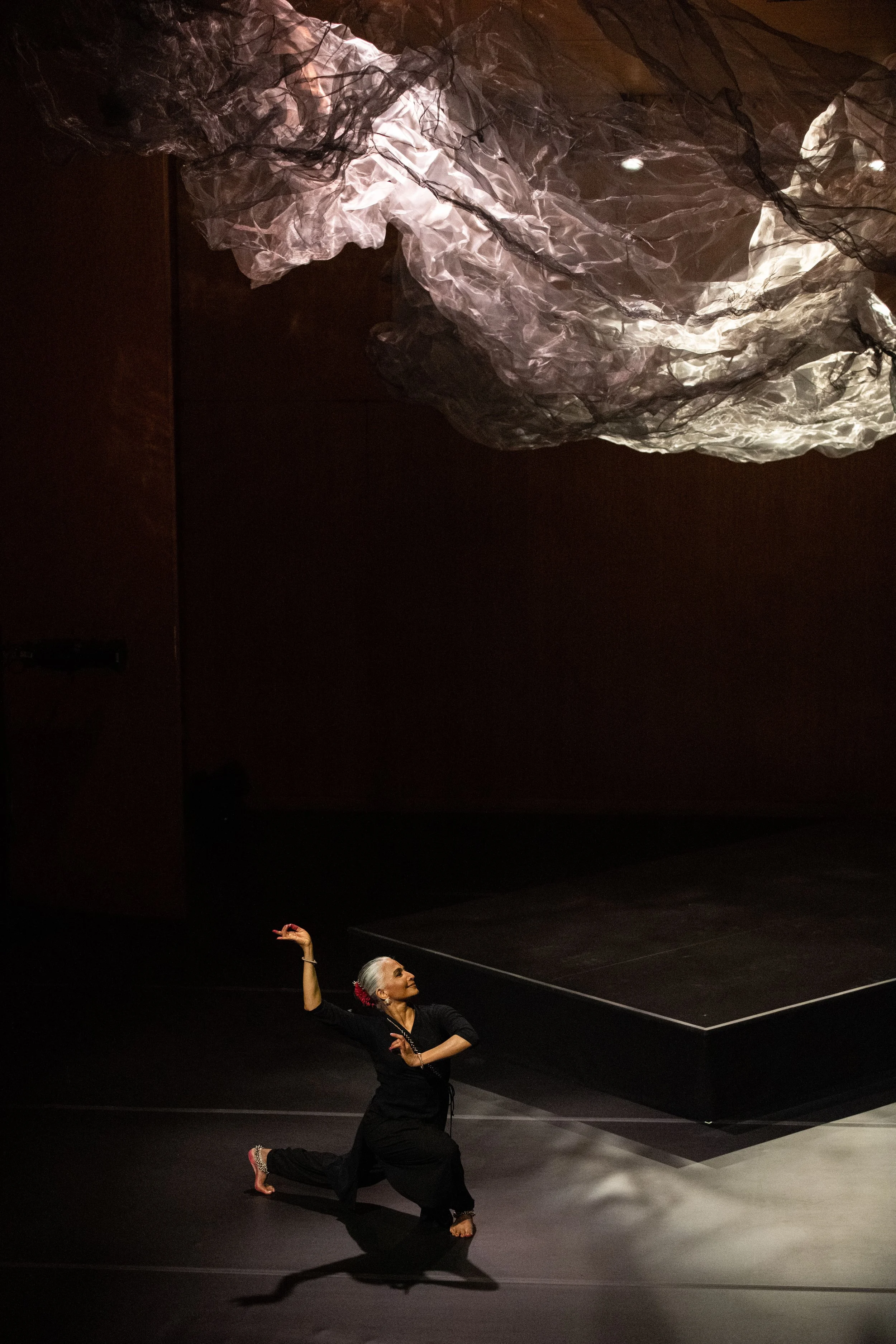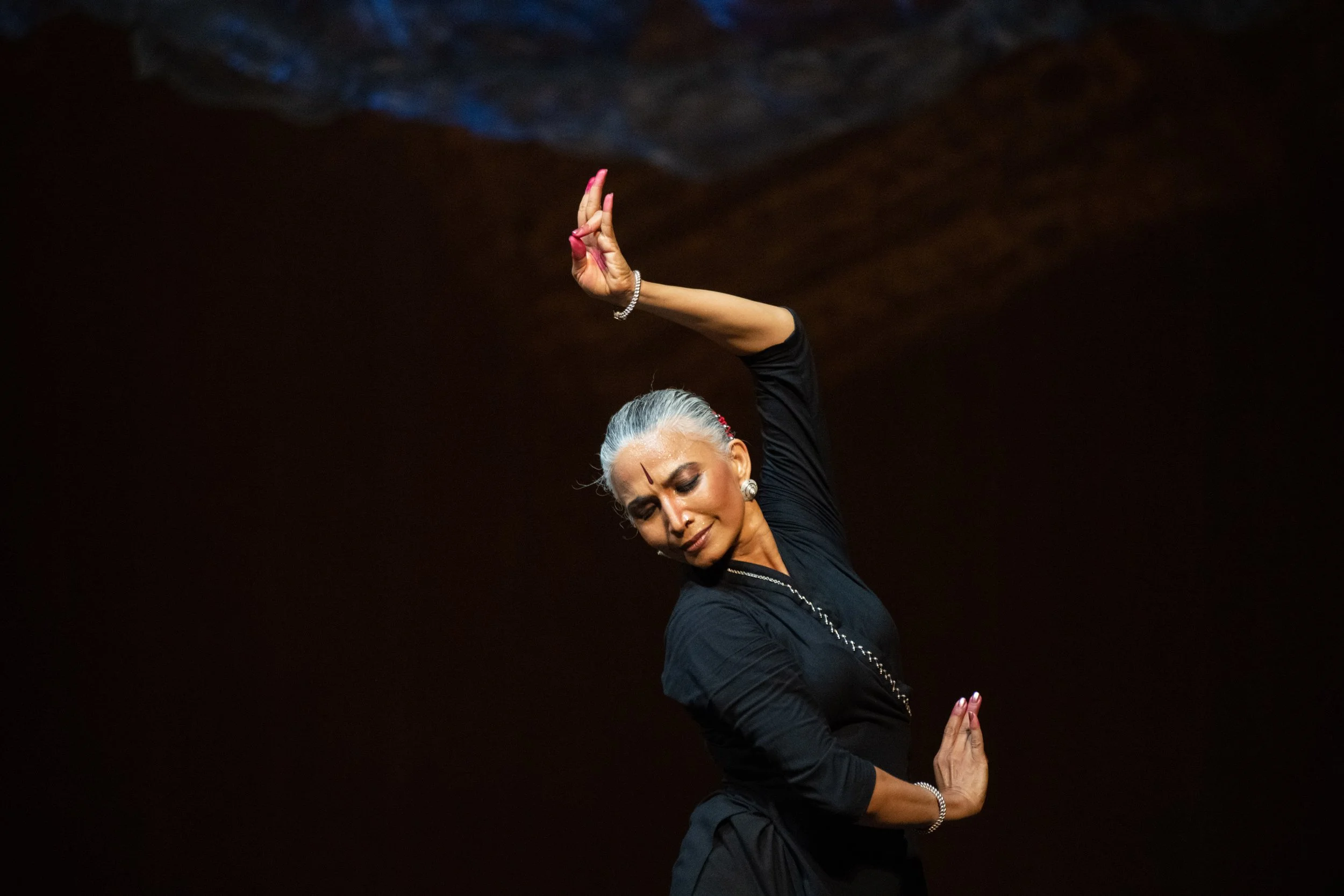 Bijayini’s long-standing interest in expanding Odissi’s physical vocabulary finds new direction in this work, which looks beyond gestural ornamentation. Here, Bijayini hones in on the skeletal nuances of Odissi’s lexicon to find abundance and sensuality within a more austere palette. She also moves away from textual narrative and performs only one couplet of poetry, written by the 18th-century Urdu poet Mir Taqi Mir. The lines address neither god nor beloved. Instead, they talk about slowing down even the smallest breath to appreciate the fragility of the universe.