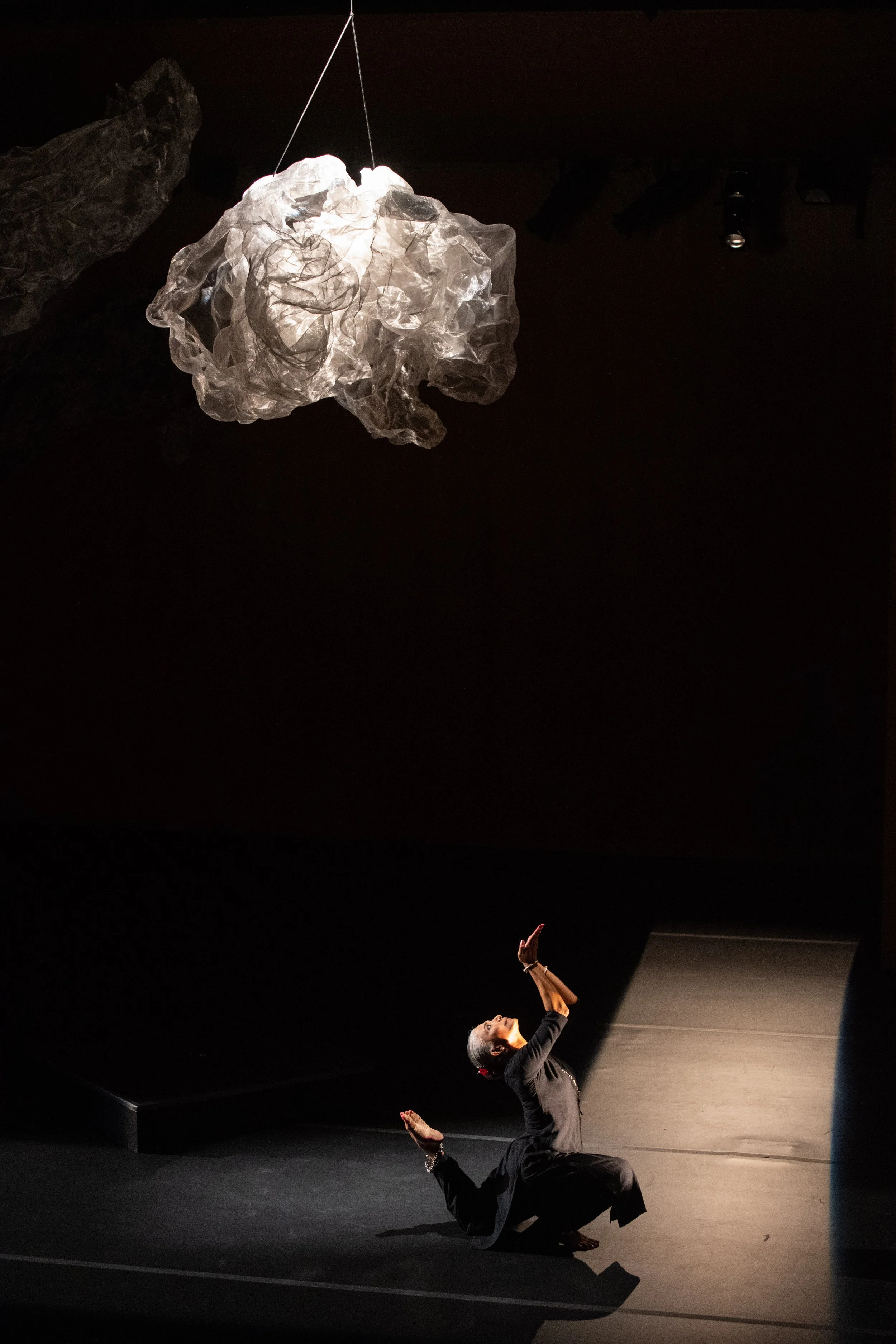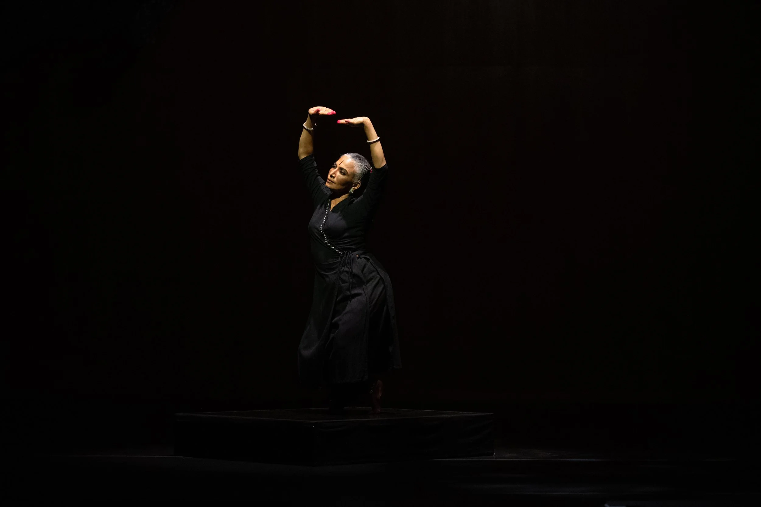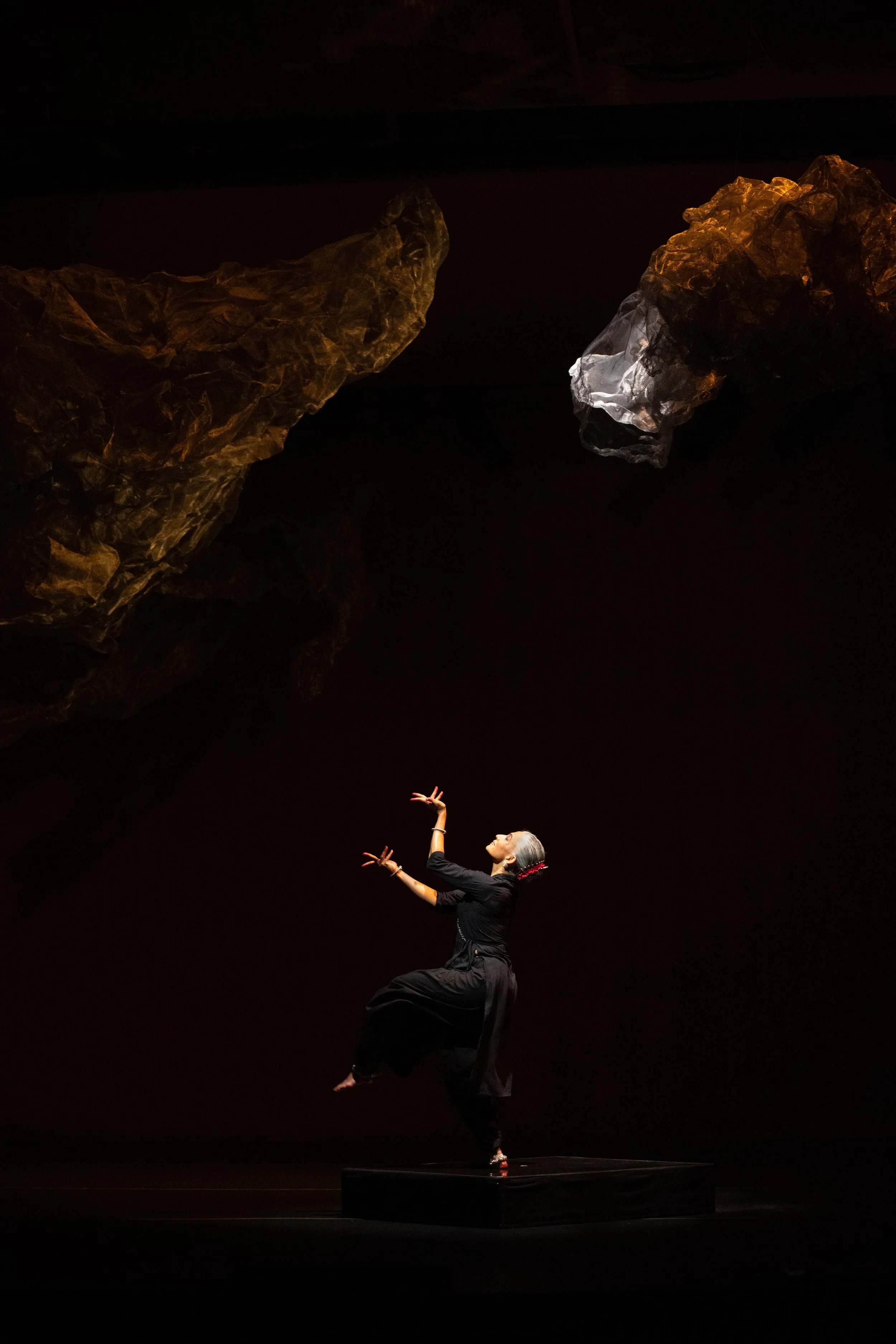 Bijayini’s long-standing interest in expanding Odissi’s physical vocabulary finds new direction in this work, which looks beyond gestural ornamentation. Here, Bijayini hones in on the skeletal nuances of Odissi’s lexicon to find abundance and sensuality within a more austere palette. She also moves away from textual narrative and performs only one couplet of poetry, written by the 18th-century Urdu poet Mir Taqi Mir. The lines address neither god nor beloved. Instead, they talk about slowing down even the smallest breath to appreciate the fragility of the universe.